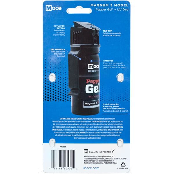 MACE PEPPER GEL is a Patented formulation of pepper spray suspended in Gel instead of a liquid stream. This Pepper Gel formulation results in several advantages.
